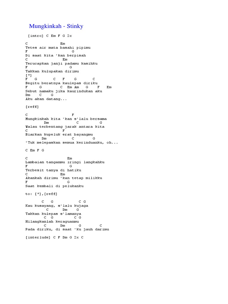 C Am F G C C G Terima kasih atas segalanya Am Yang telah kau beri F Kepada diriku C Aku ingin kau tahu G Am F Ku menyayangimu ku mencintaimu sepenuh hatiku C G Bukan seketika tapi slamanya Am F Aku takut aku takut G Kehilanganmu Pre-Chorus F G C Maafkanlah seandainya ku menyakitimu F G C Maafkanlah seandainya ku. F G terima kasih tuk semua. Intro C G Am Em F C Dm G C G Am Lelah menghitung hari Em F C Dm G Entah berapa lama kita berbagi rasa C G Am Dan bukan hanya dalam mimpi Em F C Dm G Kau tetap tersenyum dengan sejuta kasih F Em Dm F Em Dm Hati.